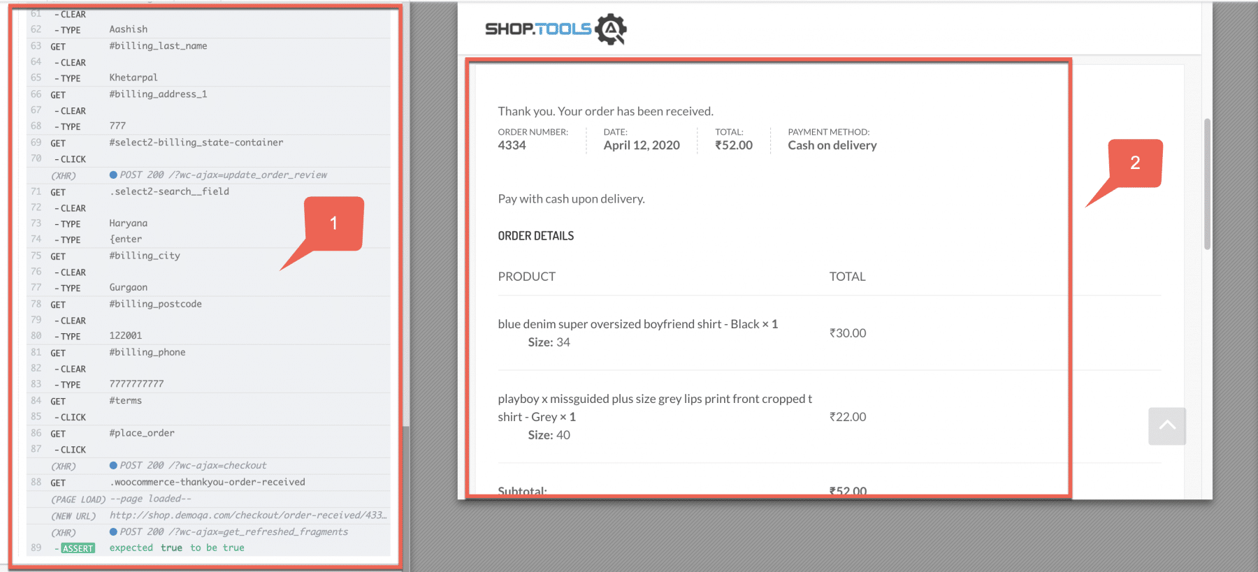 In the above screenshot, marker 1, shows that all 89 steps written in the Cypress test have been executed successfully. On the right-hand side, highlighted with marker 2, the order for 2 products has been placed successfully. Also, its order number has also generated.