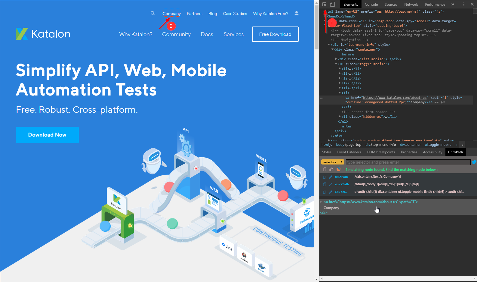You can see a console at the bottom of the developer panel. If it is not shown, find “Console” option in developer sidebar menu. You may see that there is already one XPath evaluated and element is found. When you hover over the element in a console (as I did), the found element is highlighted on the page. There are also multiple browser extensions which may help you with getting and evaluating XPaths. You can find them in the add-ons store in your favorite browser, I use addon ChroPath (available for Chrome and Firefox), but there are also many others. You can try more of them and choose the one which is the best for you.