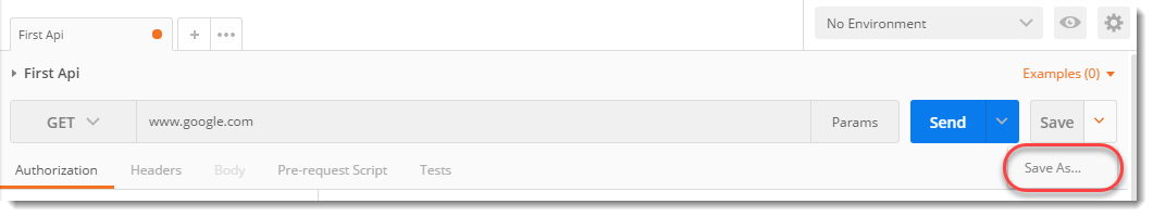 The Save As option opens the same panel which opened through New Request at the start of this tutorial. It gives the option to enter the name and associate the request to some collection.