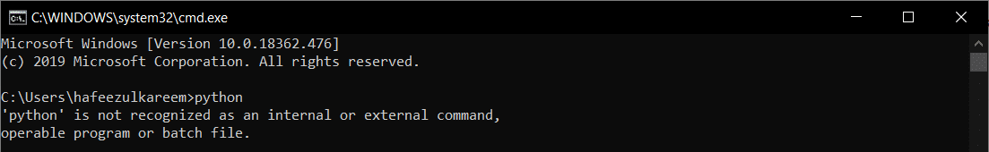 In case if you get the error, 'python' is not recognized as an internal or external command, operable program, or batch file, it means the environment variable for Python is not correctly set.