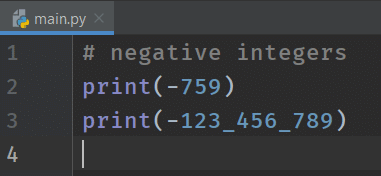 Some examples of integers are 759, -759, 123, 4, -5, etc. In addition to this, Integers don't have a fraction part. Let's see how to represent integers in Python.