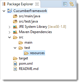 The second is to create a new resources folder under src/test/. As a standard, we keep Cucumber feature files in resources folder. And in my case, resources folder did not show up by default. So I will create my own. Right-click on the src/test/java and create a New Package. Make sure to add it under the correct path which is CucumberFramework/src/test and specify the name as resources.