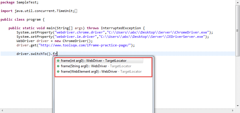 - switchTo.frame(WebElement frameElement): Pass the frame web element and driver will switch to that frame.