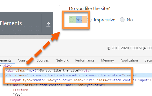 Let's have a look at an example on the web page "https://demoqa.com/radio-button" :