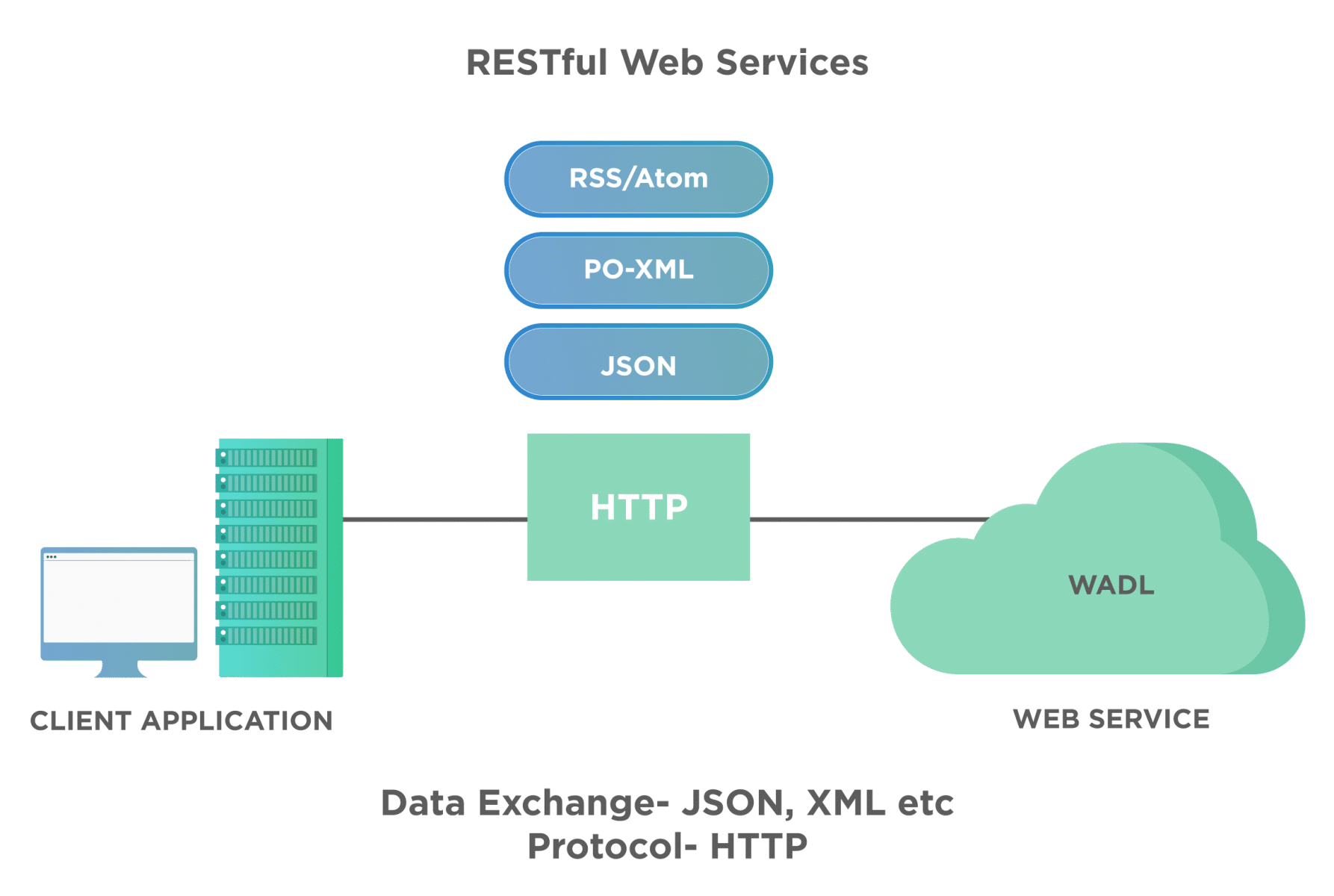 As we can see from the above picture, in the case of RESTful services, uses the Http protocol, and the data exchange can happen over formats like JSON or XML.