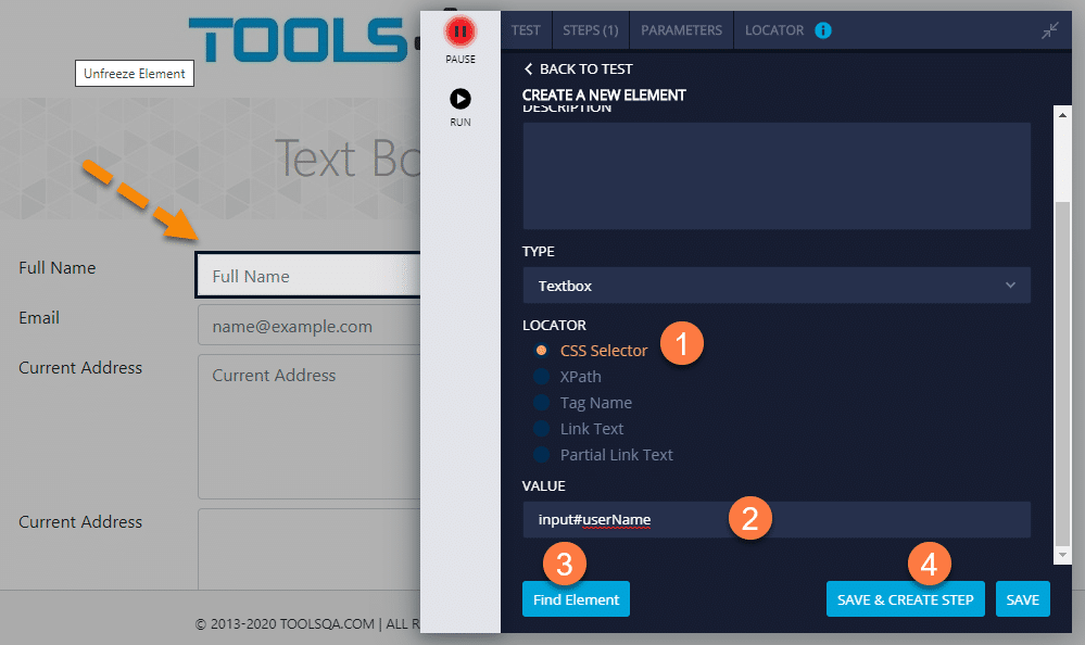 Now, let's see how we identify the same web element using the CSS locator in TestProject. As mentioned in the above section, lets first navigate to the "Create a new Element page". Then, follow the steps as shown below to locate the "Full Name" text box on the page.