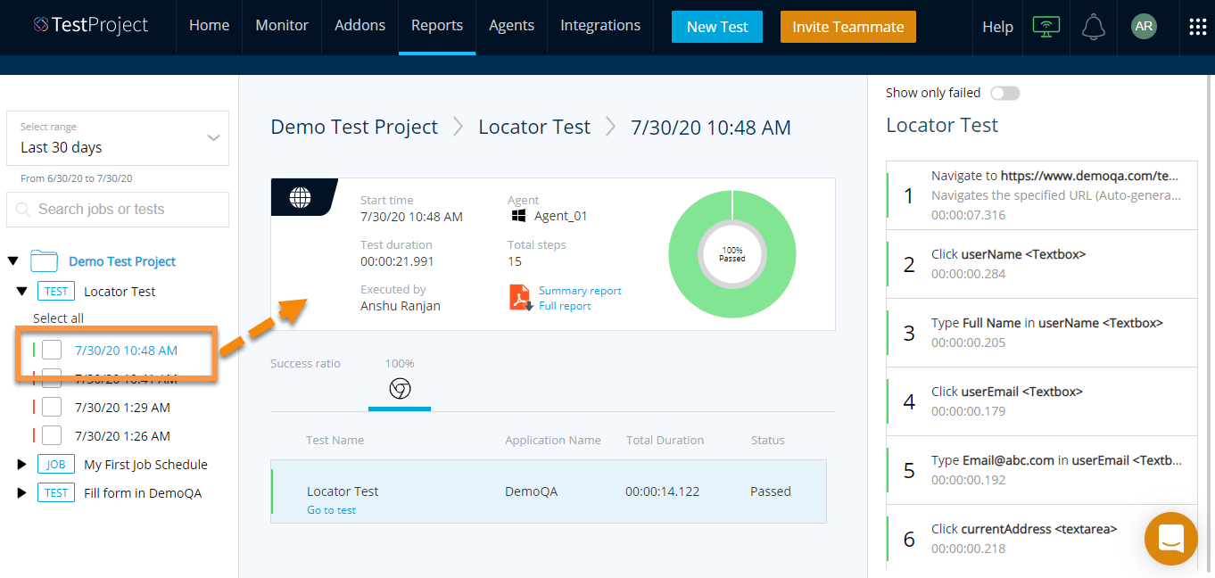 As you can see in the above image, the marked test execution is complete. The result shows pass for all test steps executed. It means all the locators and value combinations that we used were able to identify and were successful in locating Web Elements in TestProject. It means we should also be able to perform all actions on the element like entering text or performing a click on links.